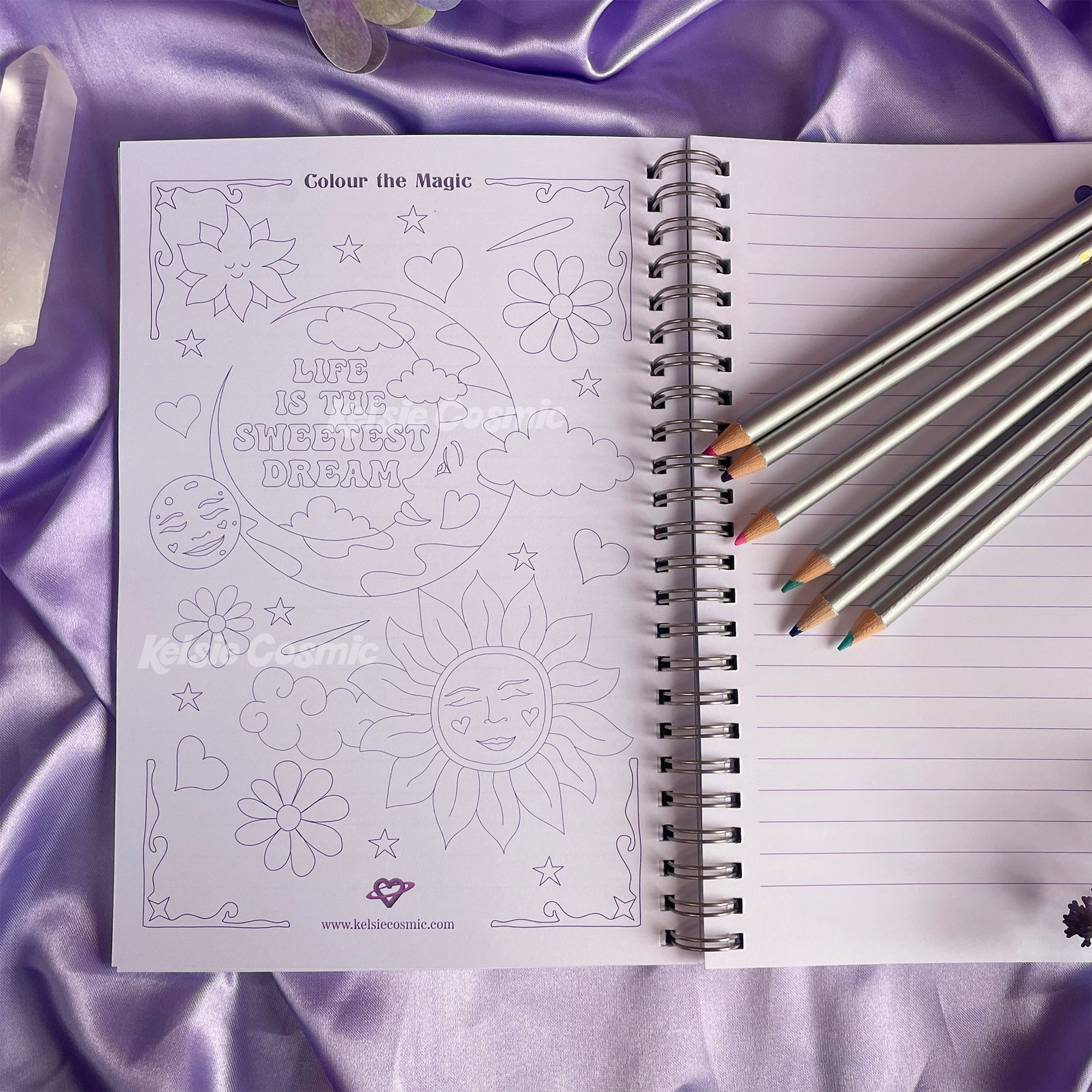 This A5 notebook is spiral bound for you to easily write, draw and colour your dreams, creative ideas, musings and all your hearts desires. The pages are made of thick 100gsm uncoated paper - perfect for sketching and writing. The left side is blank while the right side is lined. In the beginning, you will find a few pages of inspiration including journal and drawing prompts. Scattered throughout are 10 x colouring pages for when you need some mindless mindfulness.
